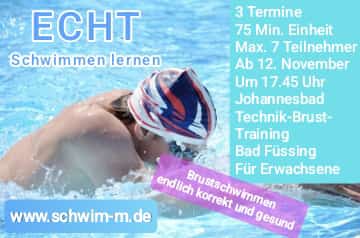 Hier geht's es insbesondere um Feinschliff im Bereich Brustschwimmen. Je nach Gruppendynamik schaffen wir evtl. mehr als das und gehen auch die Basics zum Rückenschwimmen/Rückenkraulen und Kraulschwimmen.